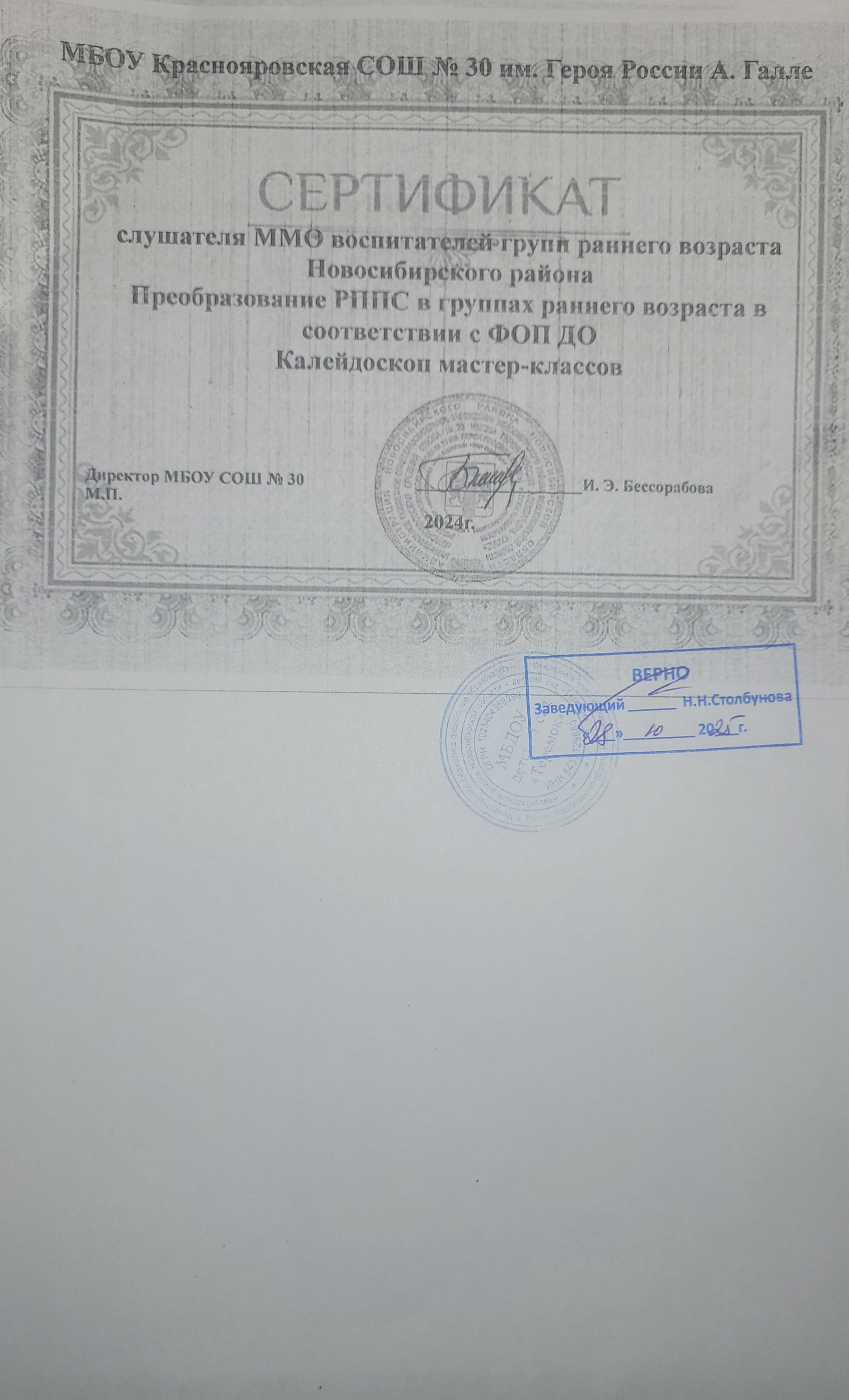 Сертификат ММО "Преобразование РППС в группах в соответствии с ФОП ДО. Калейдоскоп мастер-классов" воспитателей групп раннего возраста Новосибирского района