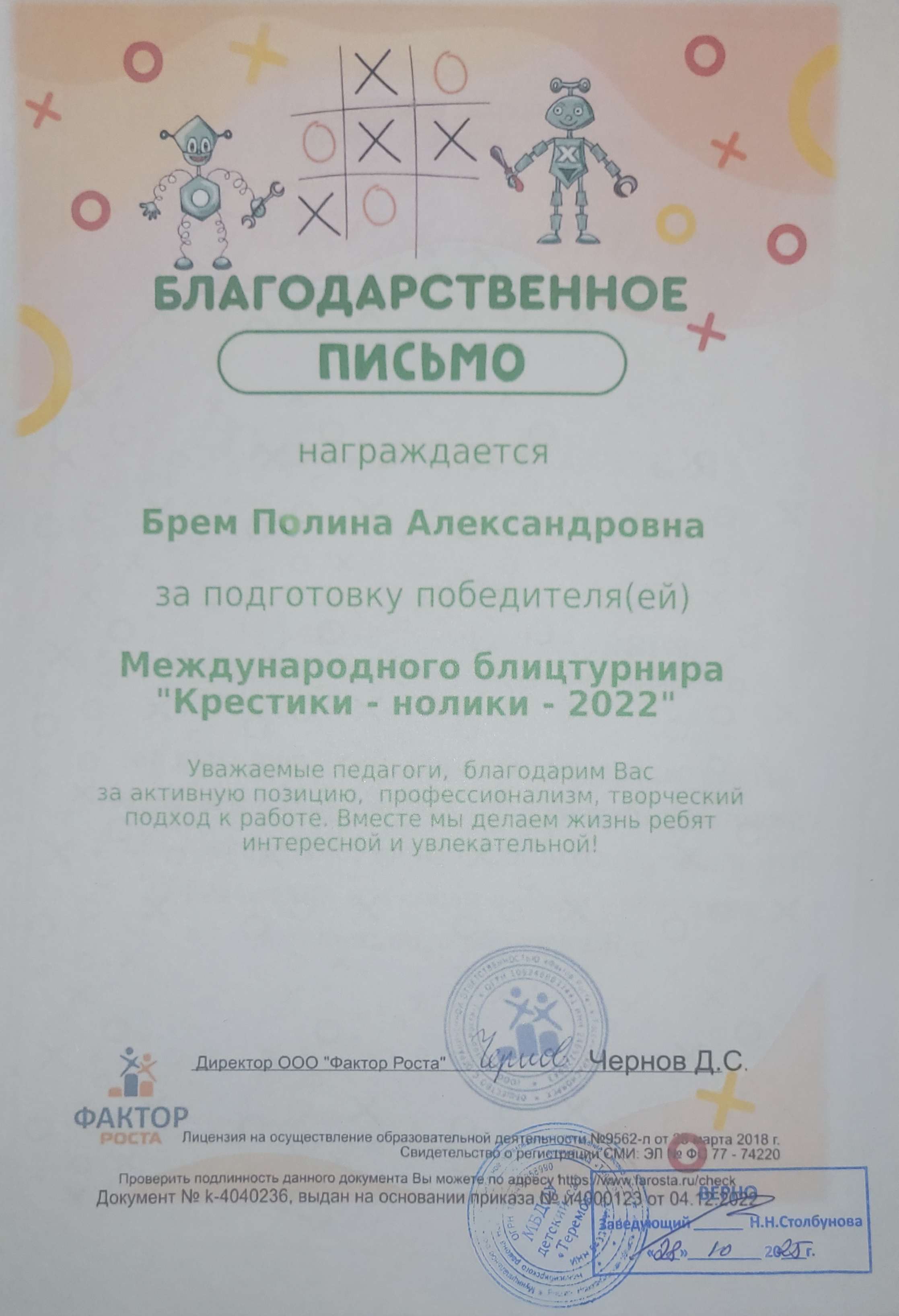 Благодарственное письмо за подготовку победителя в Международном блицтурнире 2022