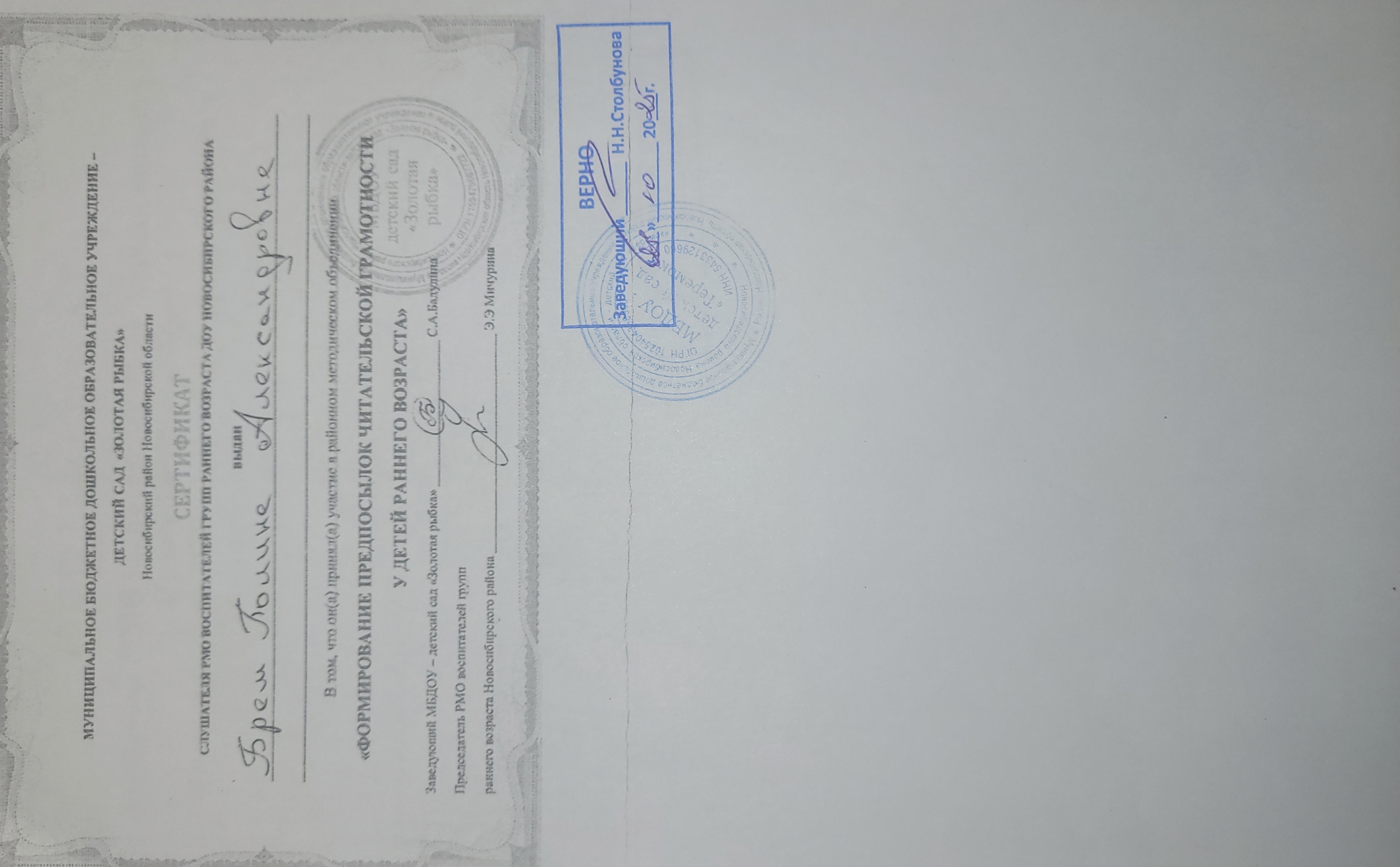 Сертификат слушателя РМО "Формирование предпосылок читательской грамотности у детей раннего возраста" воспитателей групп раннего возраста ДОУ Новосибирского района