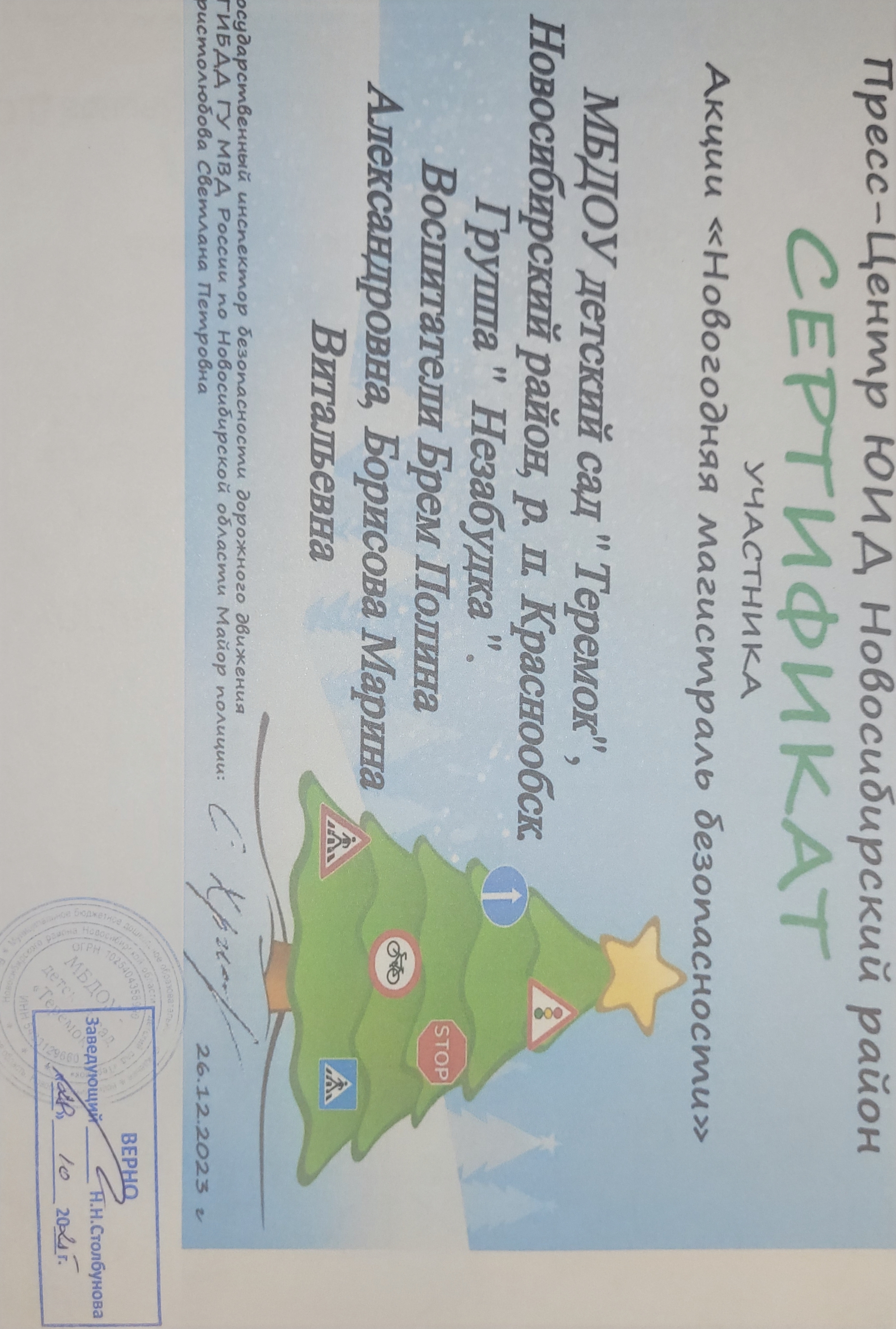 Сертификат участника акции "Новогодняя магистраль безопасности" от Пресс-Центра ЮИД Новосибирского района, 2023г.