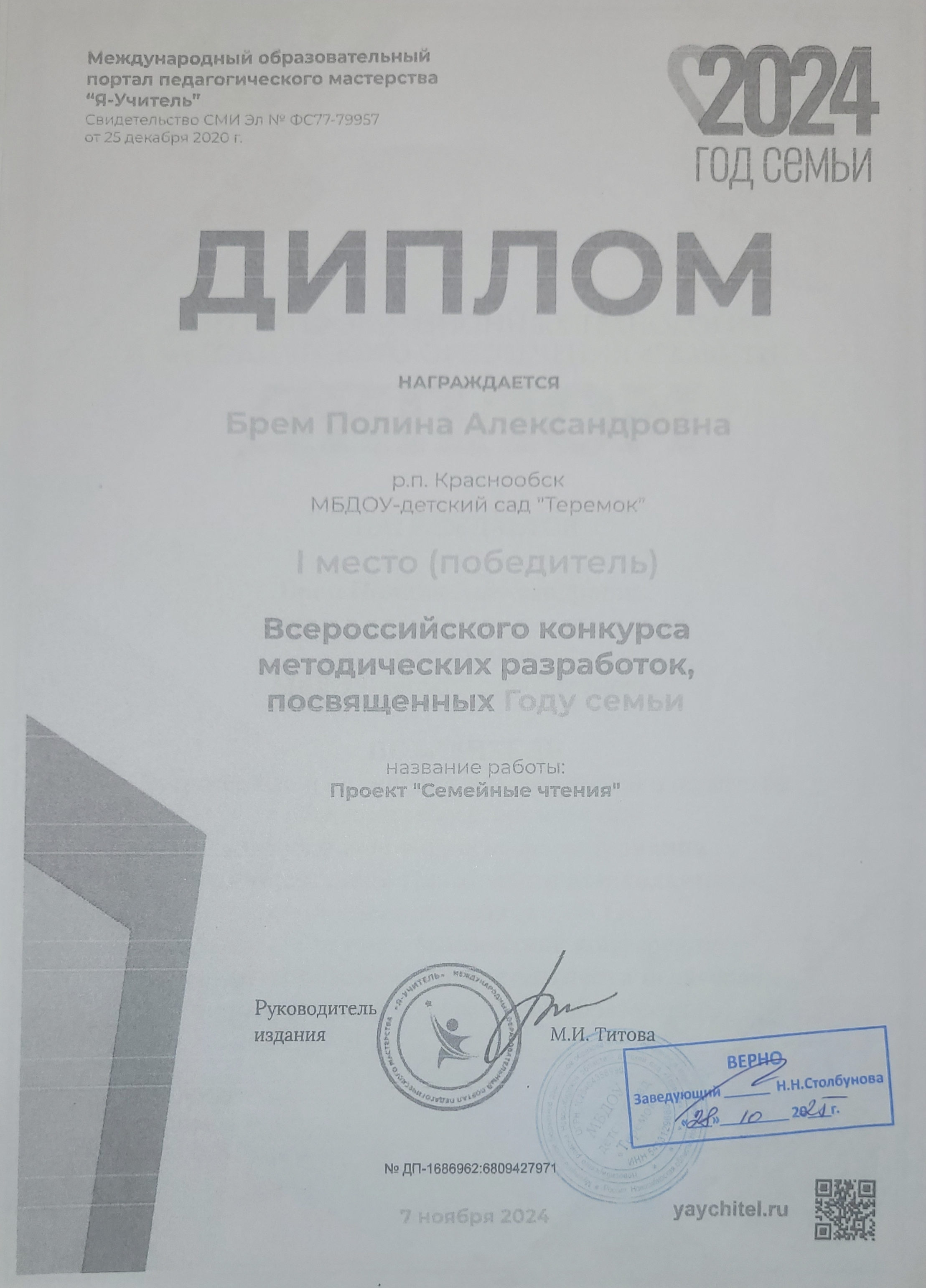 Диплом победителя, занявшего первое место во Всероссийском конкурсе методических разработок, посвященных Году семьи, 2024г.