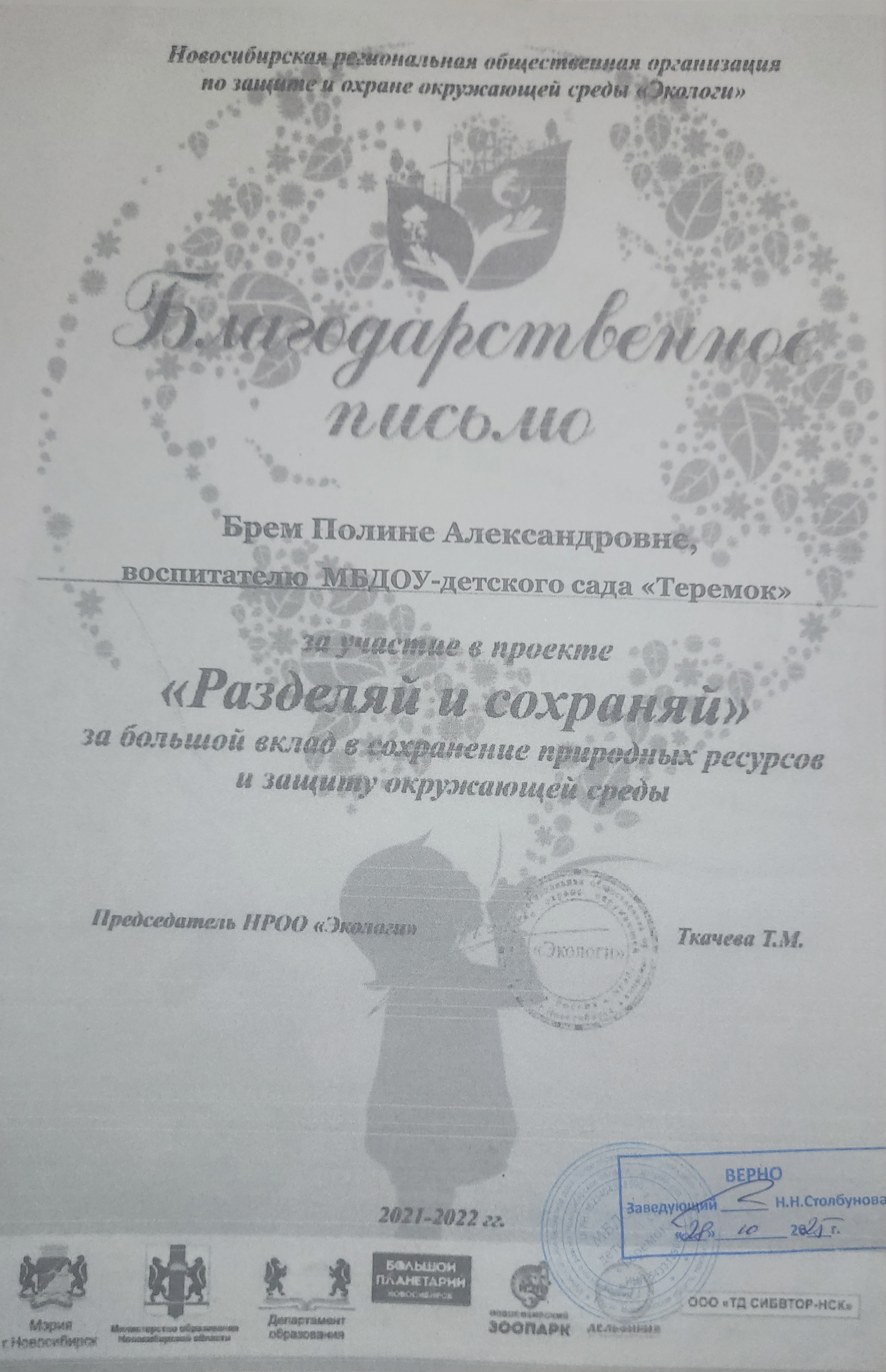 Благодарственное письмо за участие в проекте "Разделяй и сохраняй" и большой вклад за, 2021-2022 гг.