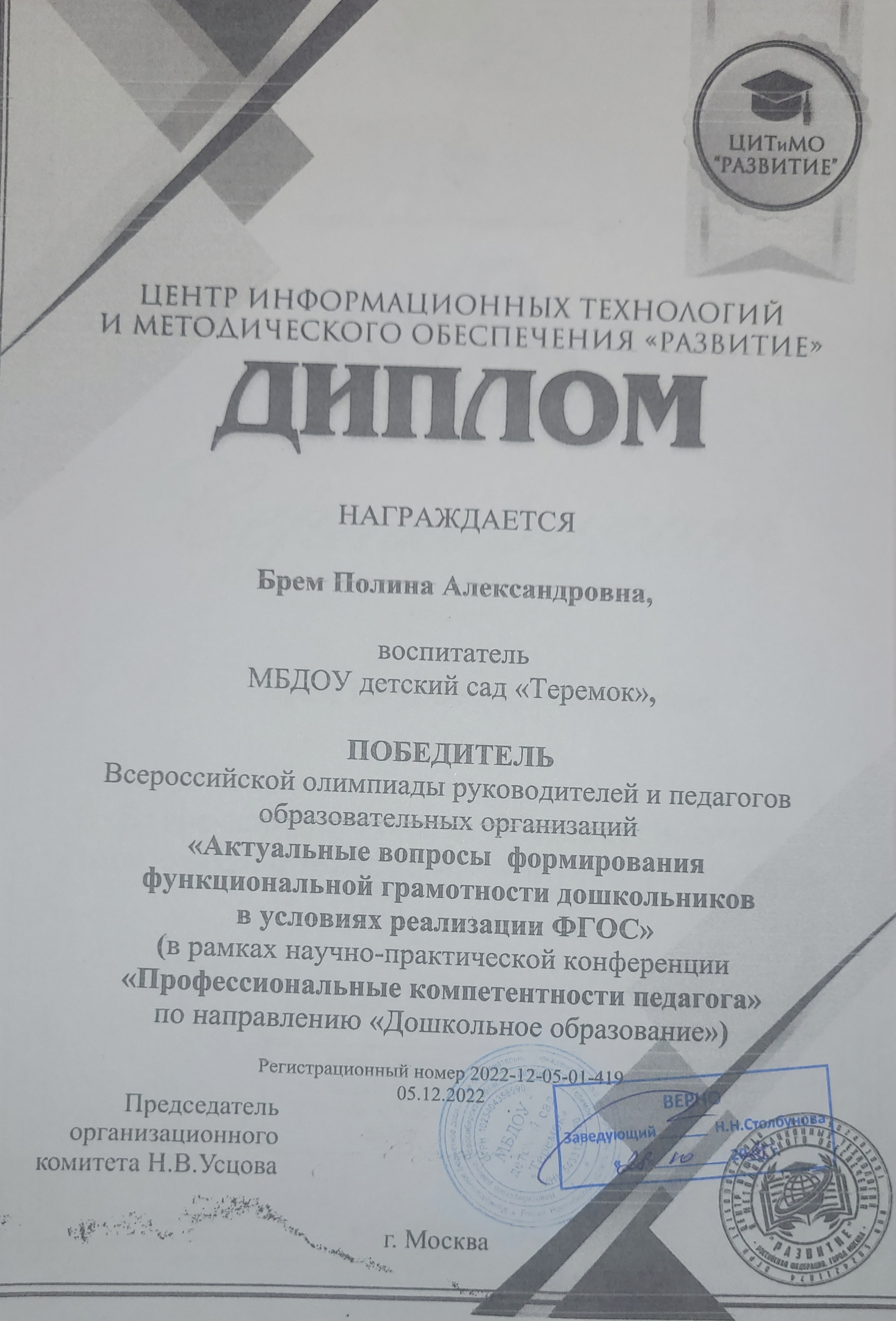 Диплом победителя Всероссийской олимпиады руководителей и педагогов образовательных организаций по теме: "Актуальные вопросы формирования функциональной грамотности дошкольников в условиях реализации ФГОС" (в рамках научно-практической конференции "Профессиональные компетенции педагога" по направлению "Дошкольное образование", 2024г.