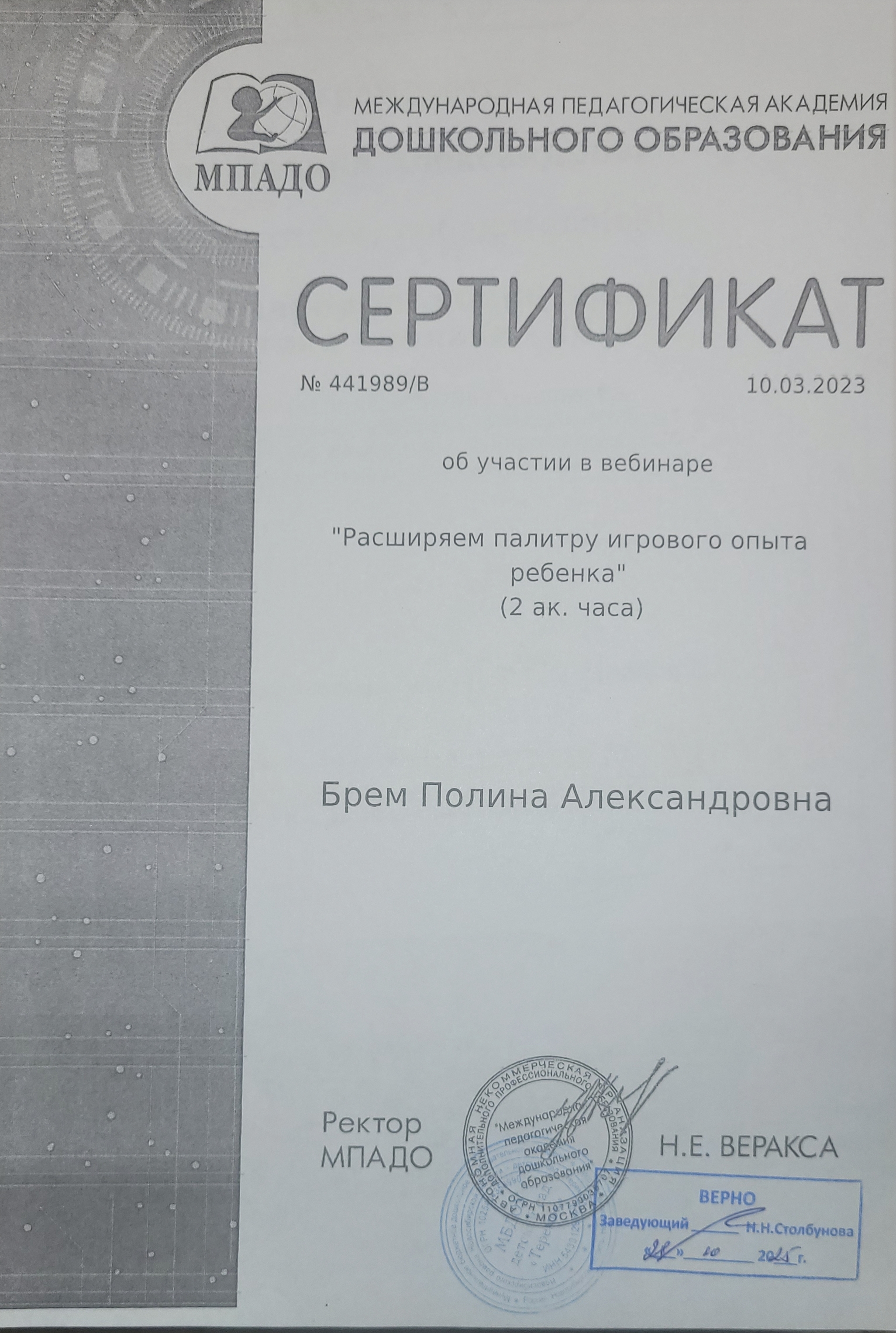 Сертификат об участии в вебинаре "Расширяем палитру игрового опыта ребенка". Международная педагогическая академия дошкольного образования