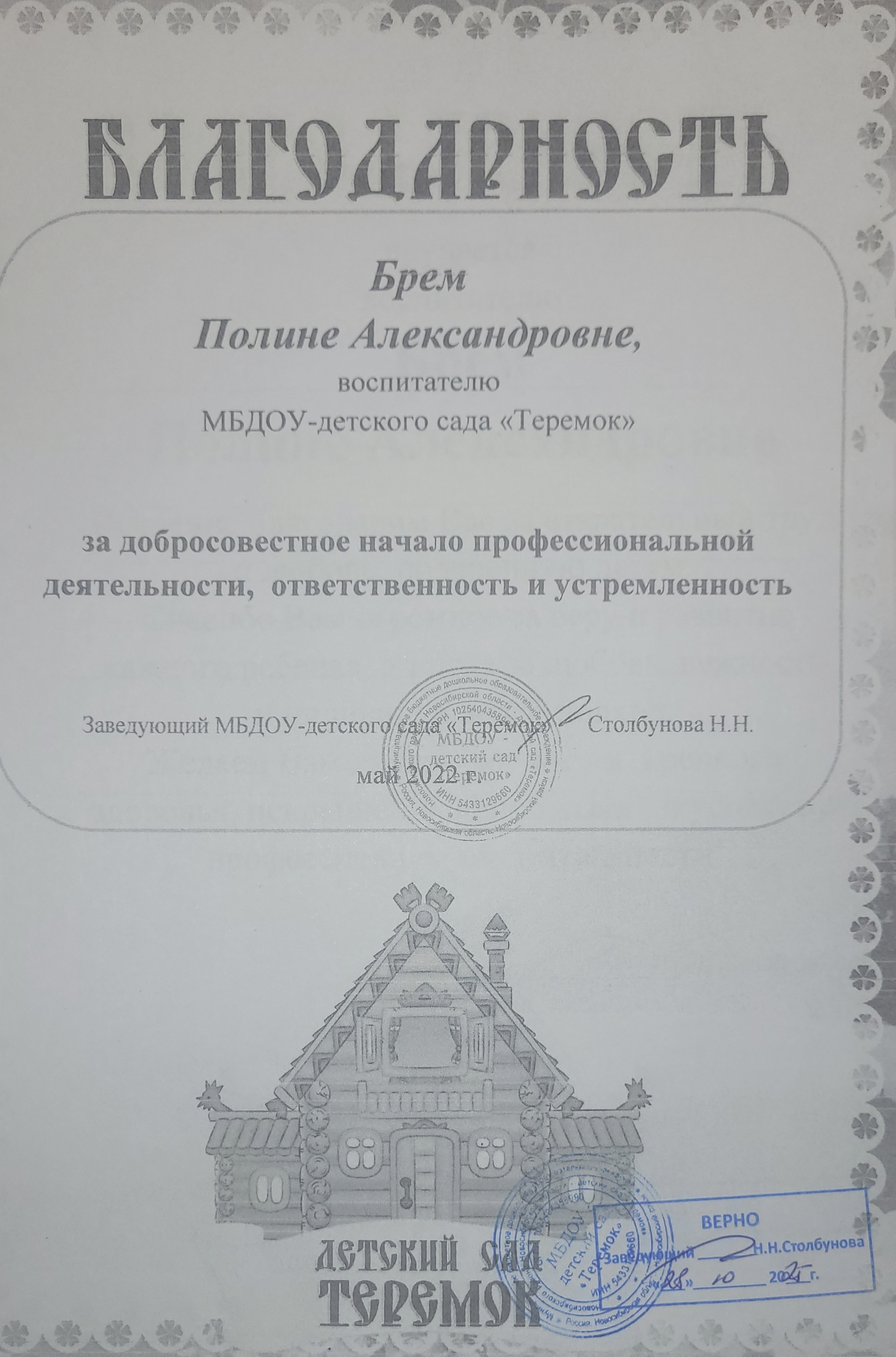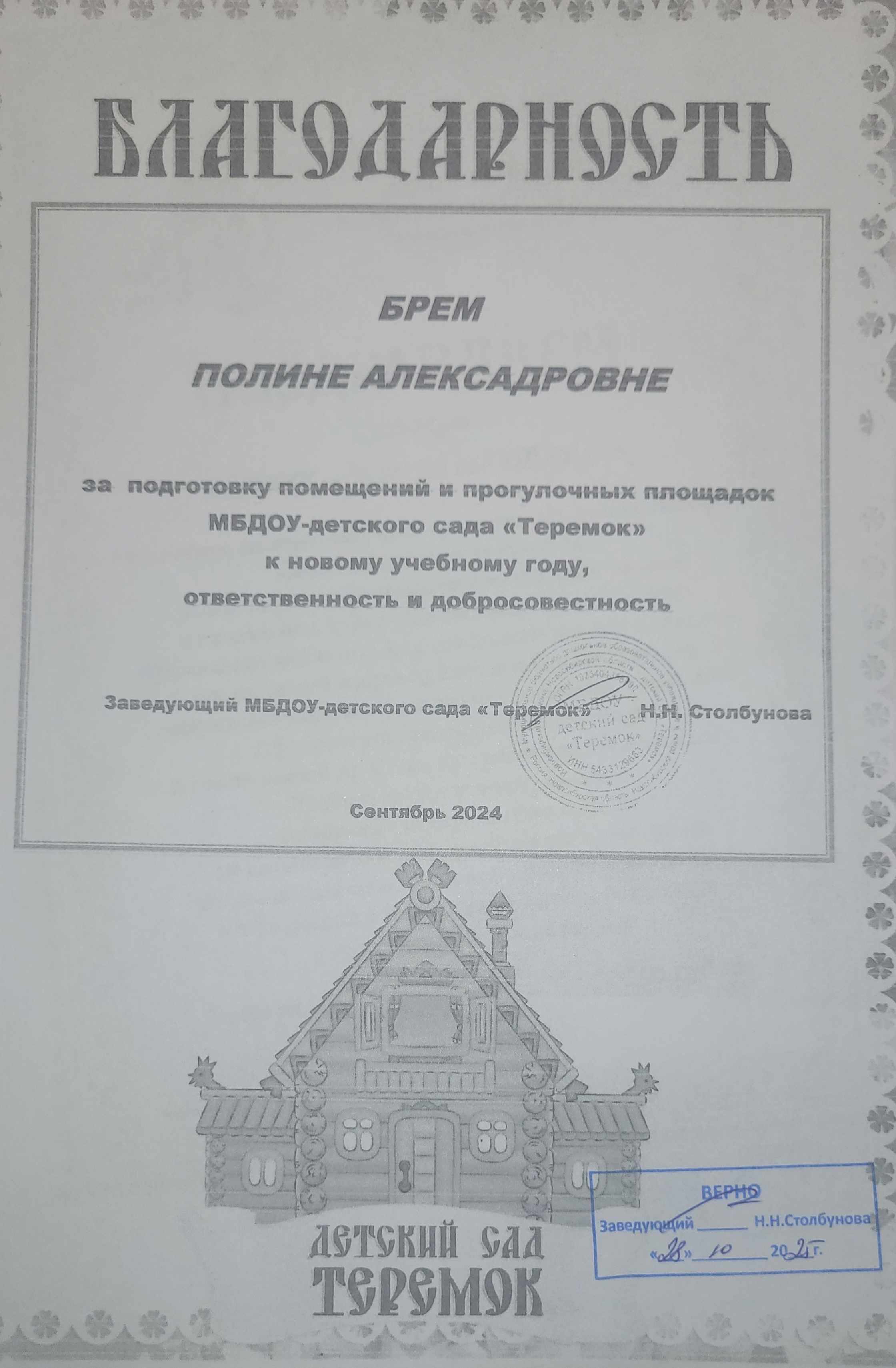 Благодарность за подготовку помещений МБДОУ - детского сада "Теремок" к новому учебному году, 2024г.