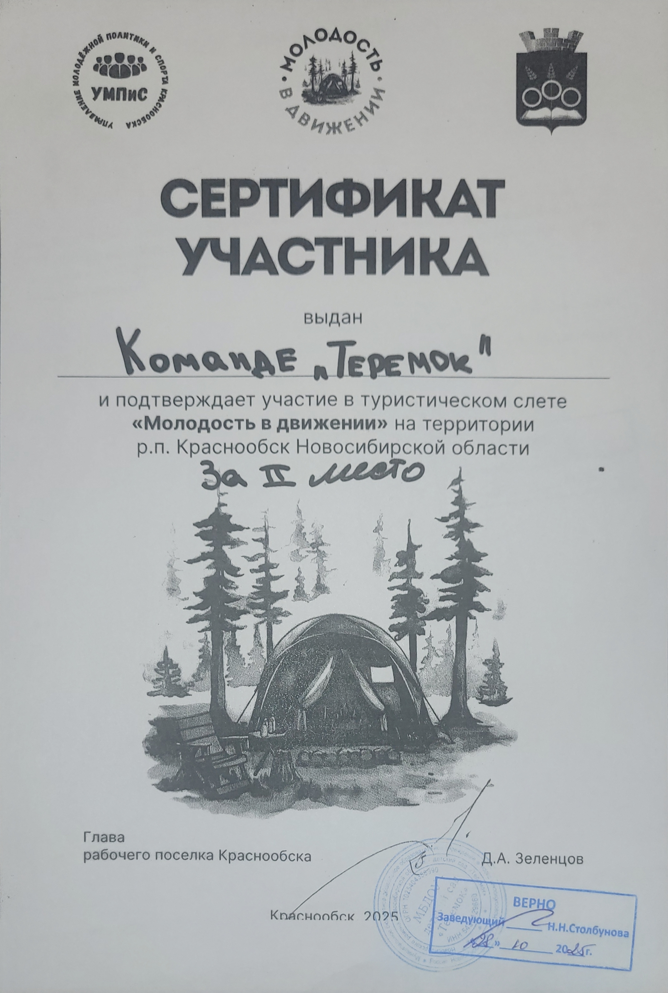 Сертификат участника туристического слета "Молодость в движении", занявшего 2 место, 2025г.