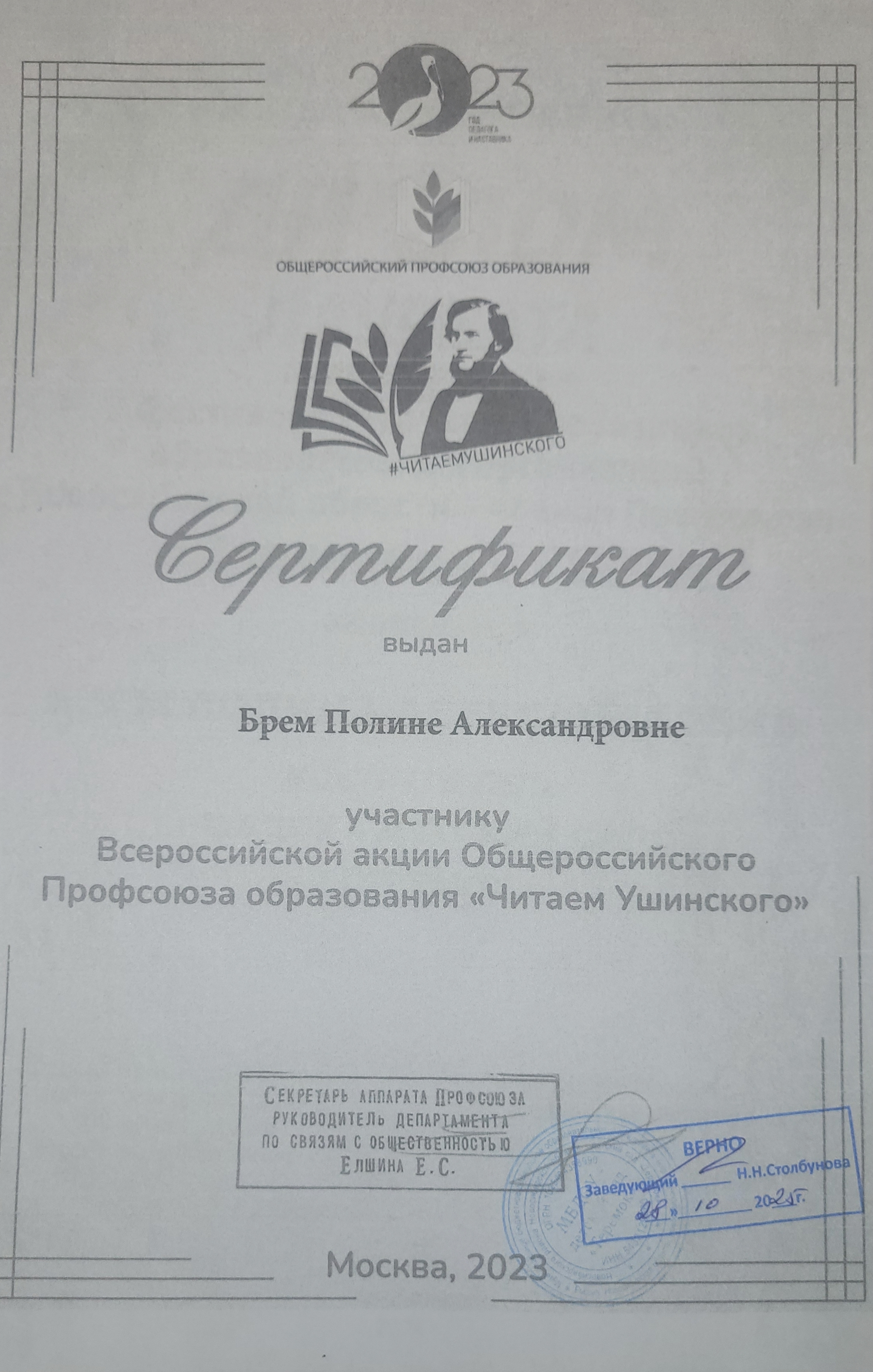 Сертификат участника Всероссийской акции Общероссийского Профсоюза образования "Читаем Ушинского", 2023г.