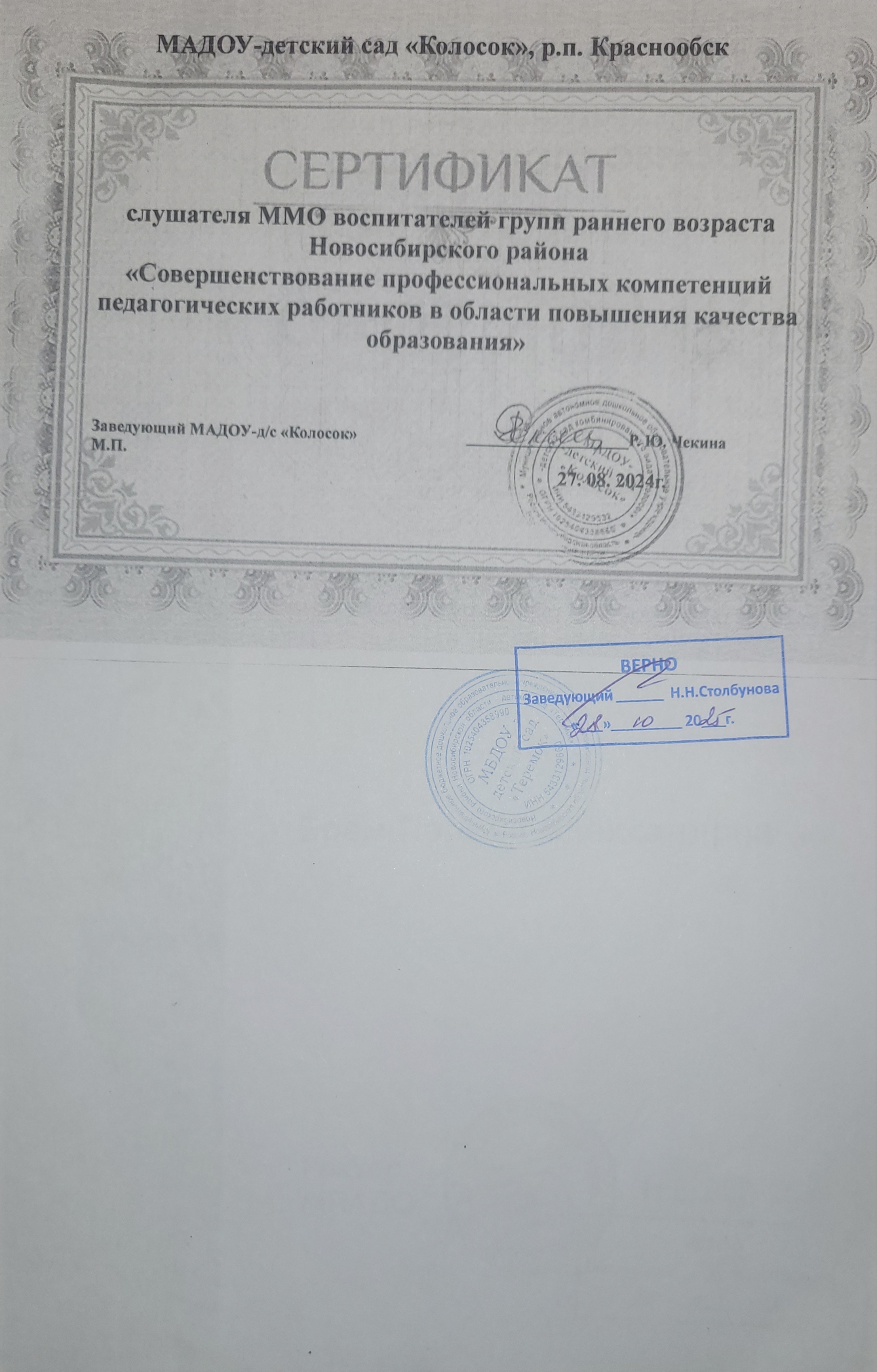 Сертификат слушателя ММО "Совершенствование профессиональных компетенций педагогических работников в области повышения качества образования" воспитателей групп раннего возраста Новосибирского района