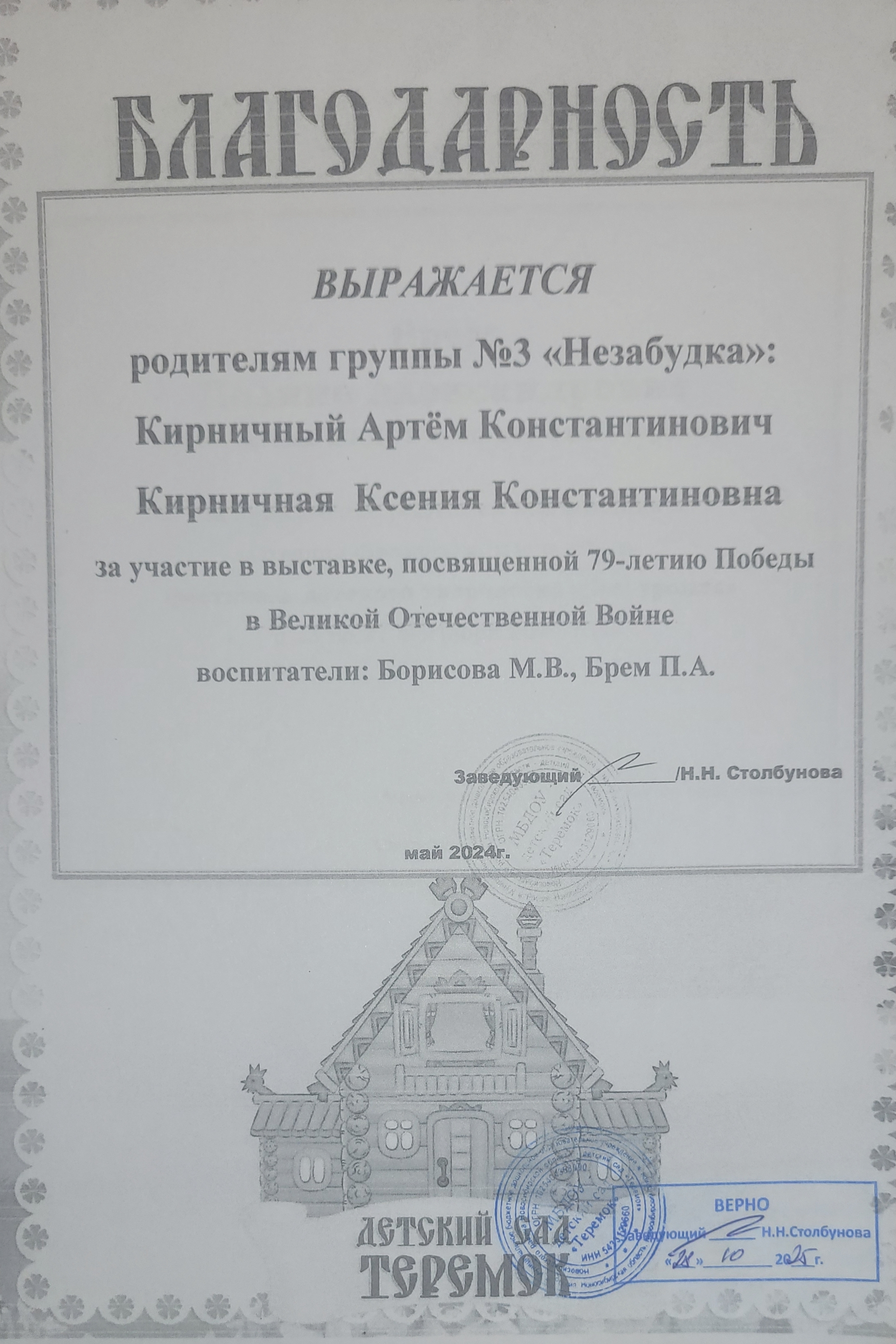 Благодарность за участие родителей в выставке Победы, 2024г.