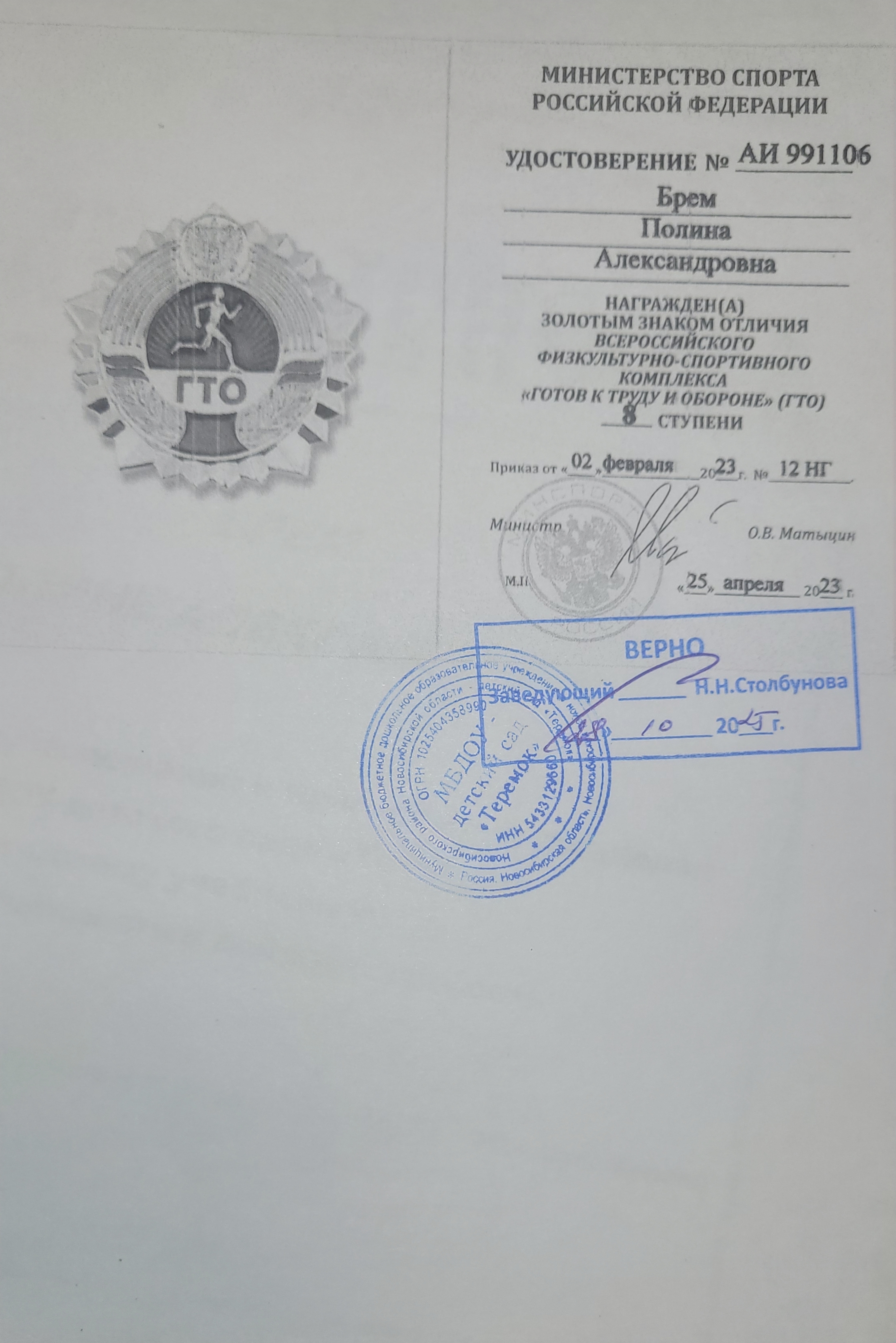 Удостоверение о награждении золотым знаком отличия ГТО, 2023г.