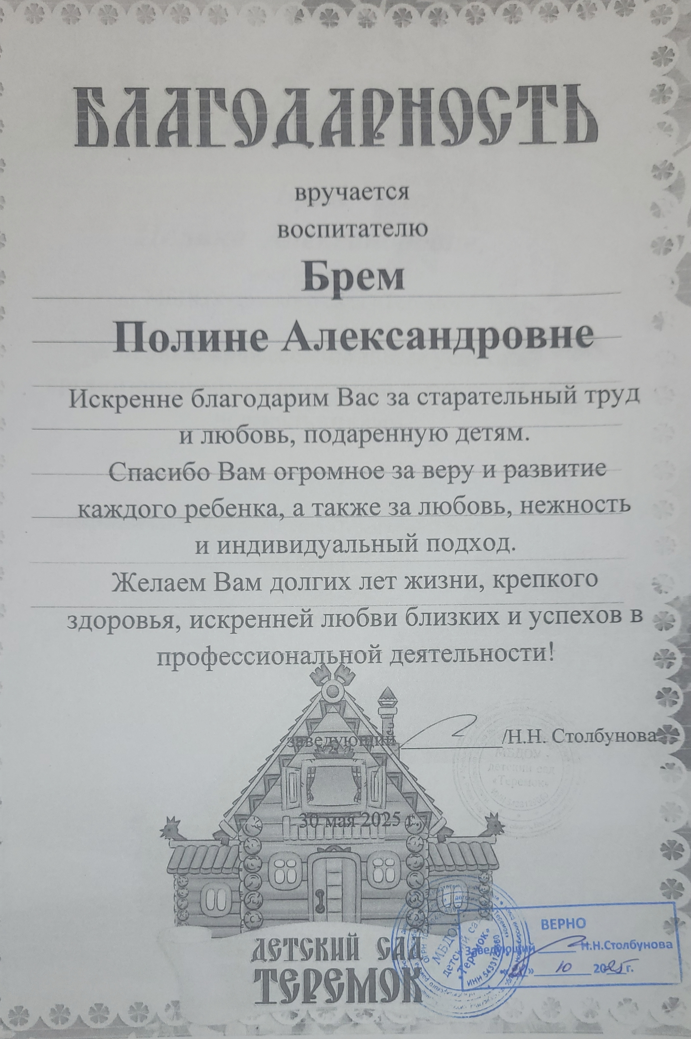 Благодарность за старательный труд и любовь, подаренную детям, 2025