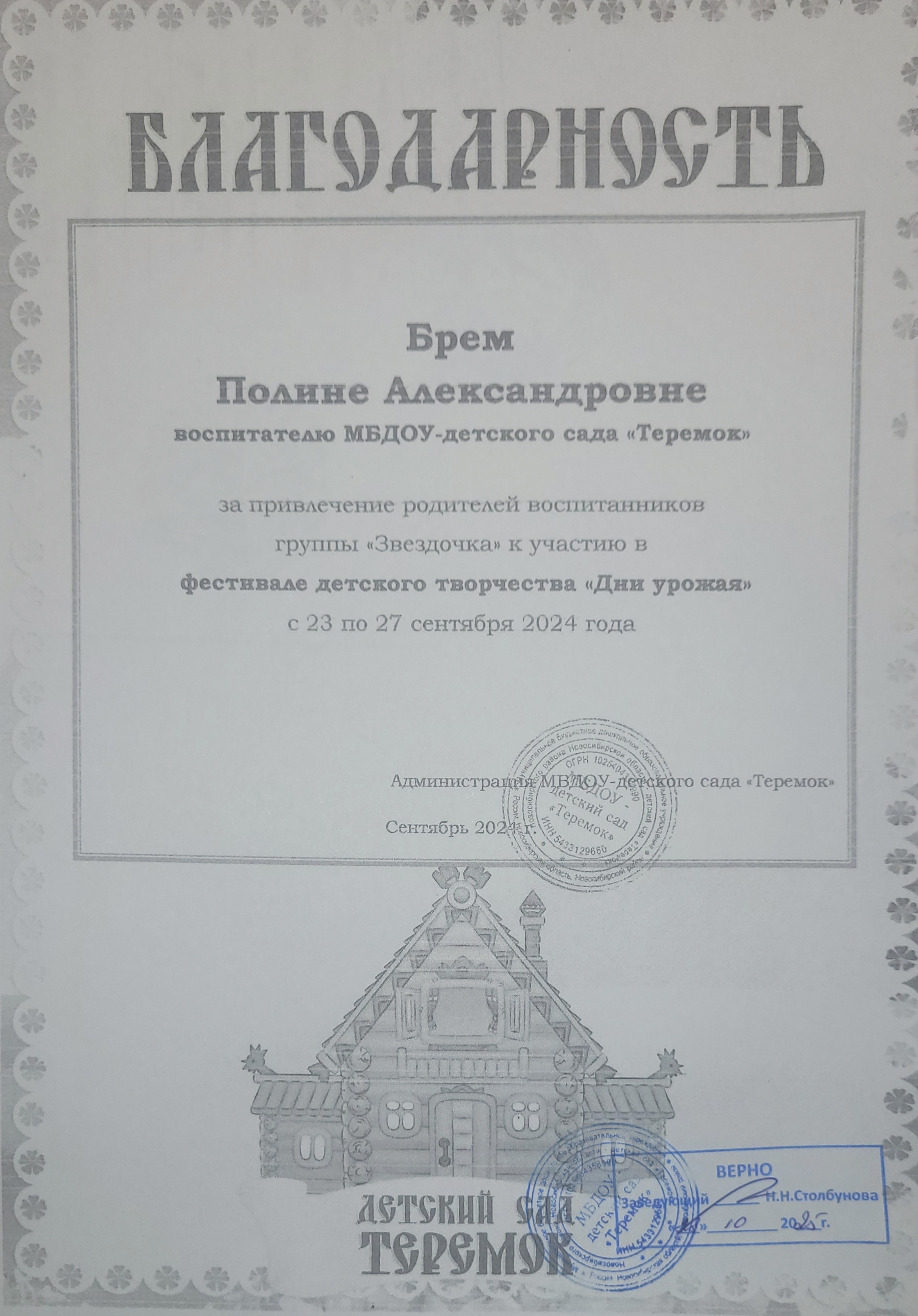 Благодарность за привлечение родителей в фестивале "Дни урожая", 2024г.