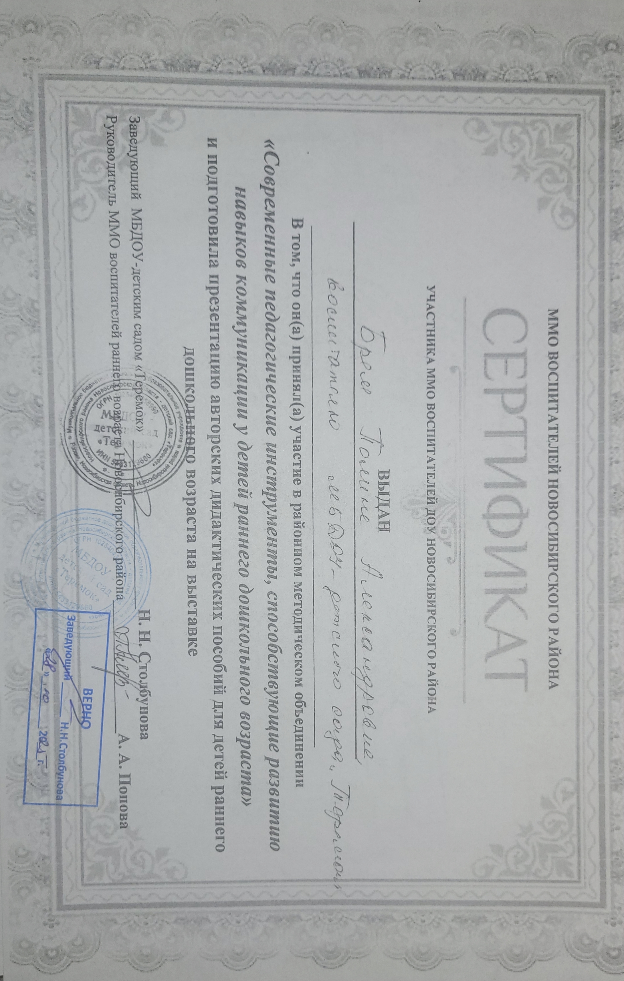 Сертификат участника ММО "Современные педагогические инструменты, способствующие развитию навыков коммуникации у детей раннего возраста"